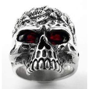 Dieser Ring aus massivem Sterlingsilber hat ein erstklassiges Gewicht und eine Haltbarkeit, die den Test der Zeit überdauert. Details wie die gebissenen Zähne und die narbige Stirn werden mit einem abgedunkelten Silber-Finish akzentuiert. Jedes Auge ist mit einem einzelnen Granatstein besetzt, der bei jeder Bewegung mühelos schimmert und funkelt. Ein Accessoire, das jeden einzelnen Bekannten auf jeden Fall beeindrucken wird.