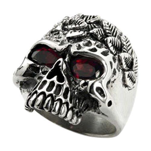 Für die kühnsten und abenteuerlustigsten Männer ist dieser Stammes-inspirierte Ring eine wahrhaft einzigartige Ergänzung jeder Kollektion. Von dem Heiligenschein aus strukturierten Blättern, die seinen Kopf detaillieren, bis hin zu den tief einhüllenden roten Augen, die Sie hereinrufen, verkörpert dieses Totenkopfgesicht ein Gefühl purer Stärke. Es wurde von unseren erfahrensten Silberschmieden gefertigt und auf höchstem Niveau verarbeitet.