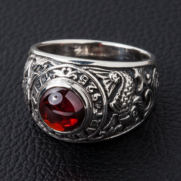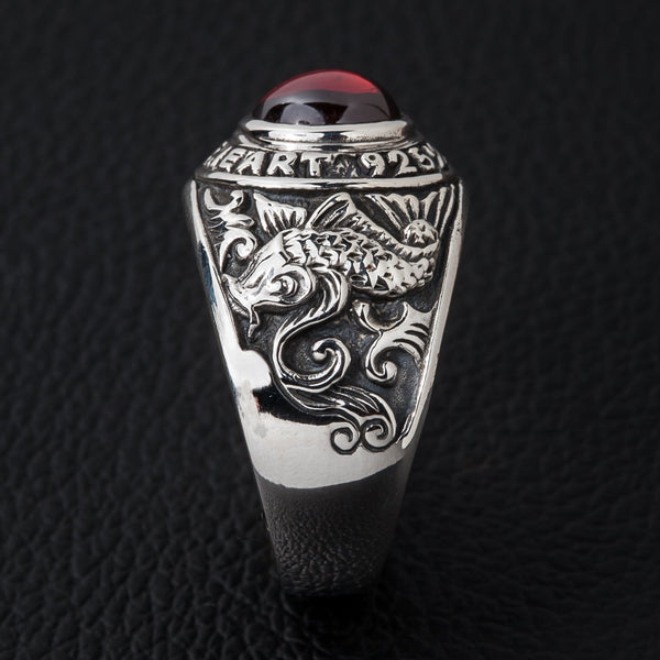 Si quieres algo un poco más elegante y menos típico para tu próximo anillo de motociclista, esta pieza no vendrá mal. Con un centro de gemas bellamente pulido y un intrincado patrón de pez Koi en cada lado, este anillo para hombre Koi Ruby Silver es a la vez atrevido y elegante.