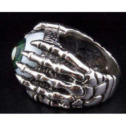 Fabriquée en argent sterling massif, cette superbe pièce est sertie d'un grand globe oculaire vert, soutenu par des serres et des griffes de dragon. La conception de la bague lourde est solide et robuste, parfaite pour toute collection de bagues de motards.