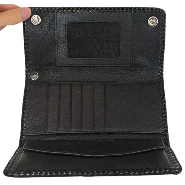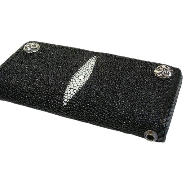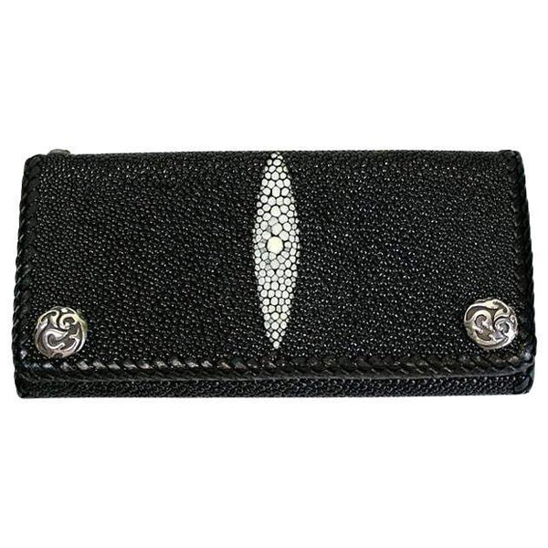 Con la sua trama unica di ciottoli e i dettagli decorativi bianchi, questo portafoglio da uomo a tre ante in pelle di razza nera sarà un regalo straordinario per ogni occasione. Realizzato a mano con materiali rari e belli, è dotato di un esterno in vera pelle di razza con una brillante finitura perlata, un interno in resistente pelle di vacchetta e abbellimenti in argento sterling 925, tra cui bottoni a pressione e un pratico attacco a catena per portafoglio.<Per comodità, questo portafoglio in pelle di razza Tri-Fold è dotato di uno scomparto a tutta lunghezza per banconote e banconote, sei fessure per carte di credito o di debito, uno scomparto con bottoni per monete e biglietti da visita e una finestra per documenti d'identità. L'ultimo portafoglio da motociclista per il lavoro e il gioco, è a dir poco perfetto.