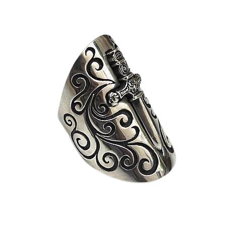 Avvolgendo l'intero dito, il nostro anello spada con scudo medievale è un segno di vera protezione. Questo anello grande e appariscente prende il controllo di ogni situazione. Lo scudo curvo abbraccia il dito e mostra un design accattivante di intricati turbinii e segni medievali. All'interno di questo, la lama affilata e decorativa della spada di un combattente si erge in modo prominente - un avvertimento per tutti coloro che scelgono di avventurarsi vicino.