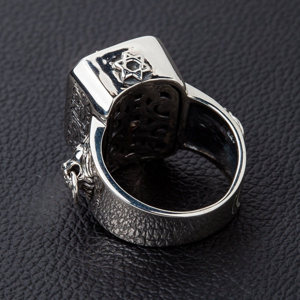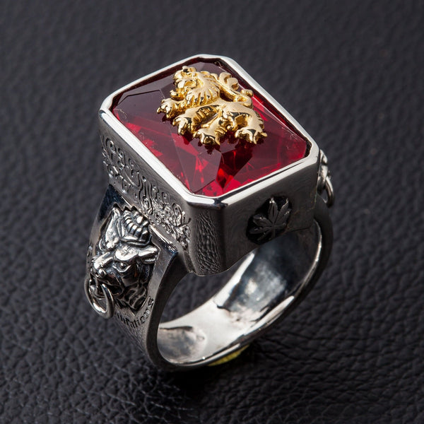 The gorgeous gold lion has been intricately carved and placed upon a shiny red stone, set inside our thick-set 100% solid sterling silver band. Reassuringly heavy and polished to perfection, our master silversmith has worked tirelessly to create a ring that is masculine, symbolic and stately, with additional gargoyle detail on the side, intended to ward away evil spirits.