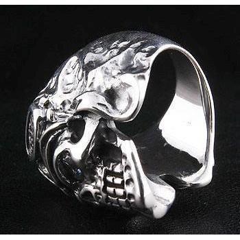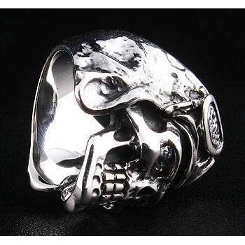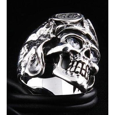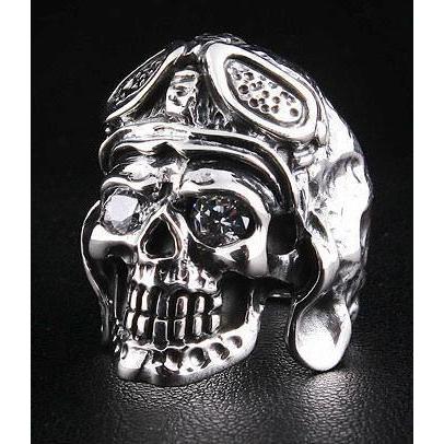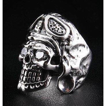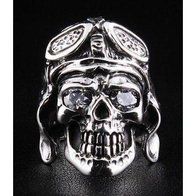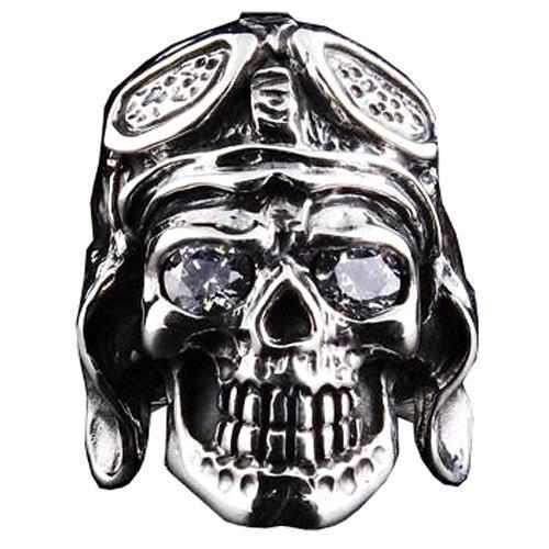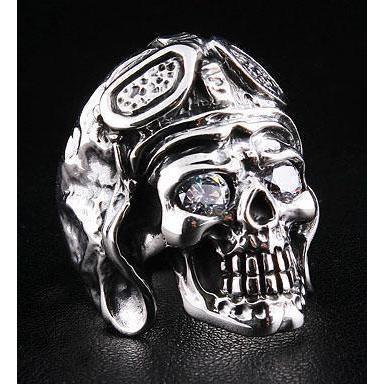 Masculine and bulky, this WW2 Axis Aviator Pilot Skull ring has been designed for anyone wanting to make a statement. The eye sockets of the skull have been filled with synthetic diamond CZ stones, these clear stones make the ring even more appealing.
