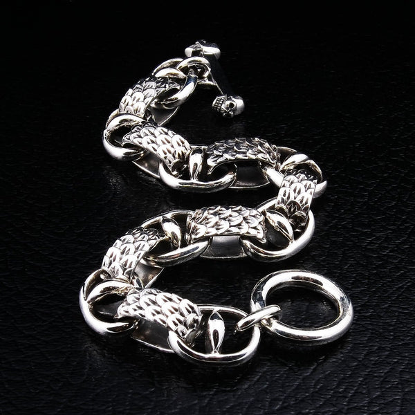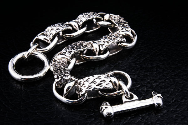 Utterly unique, our Silver Snake Bracelet takes its inspiration from one of the worlds deadliest creatures. The pitted scales of a slithering snake find their way on to polished silver links with darkened accents to highlight detail. Although simple in design, it makes a bold statement when worn on its own or with other jewellery.