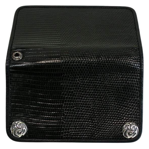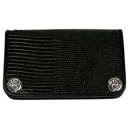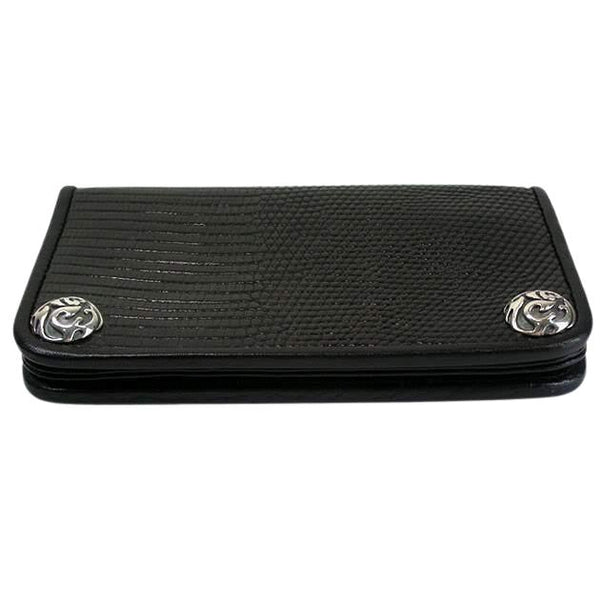 Unique and timeless, this Black Lizard Bi-Fold Leather Wallet coordinates effortlessly with working attire, formal wear, and biking gear, making it a versatile investment for bikers, rockers, and truckers who always like to look their best. Sterling silver stud fasteners and a matching wallet chain grommet add the finishing touch to this one-of-a-kind wallet for men.