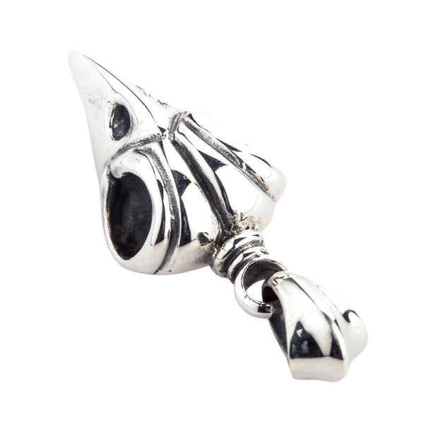 We crafted this pendant of sterling silver, which alternates highly polished and darkened parts for a dramatic effect. Silver is the best choice for amulets and talismans because of its mysterious powers. Silver and skull symbols make a perfect duo, and their powers are mutually enhanced. Just like many other pieces in our inventory, this pendant is made by hand. Make sure to add a 2 mm silver chain necklace to your order to make this pendant wear-ready.