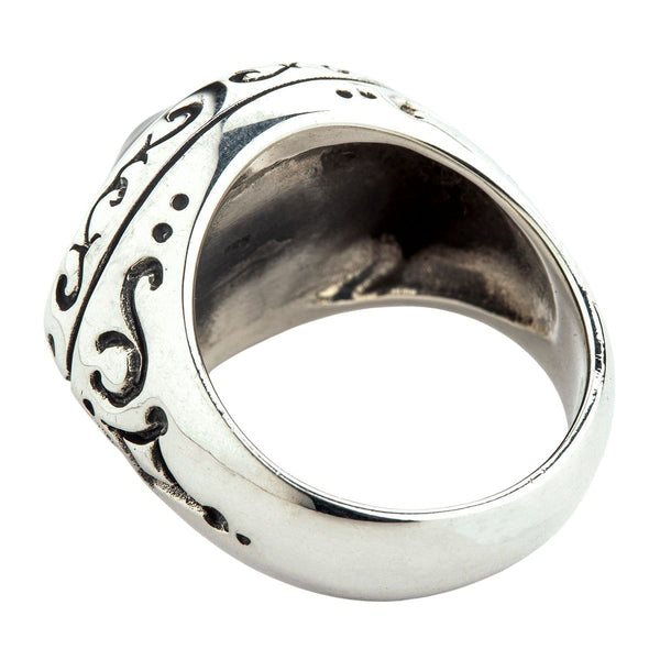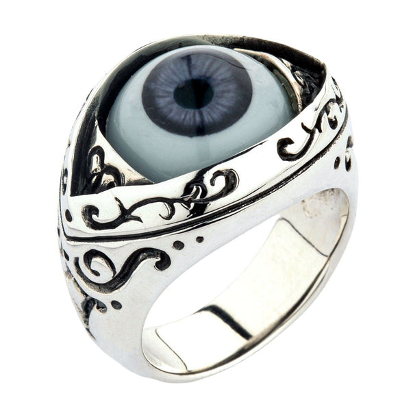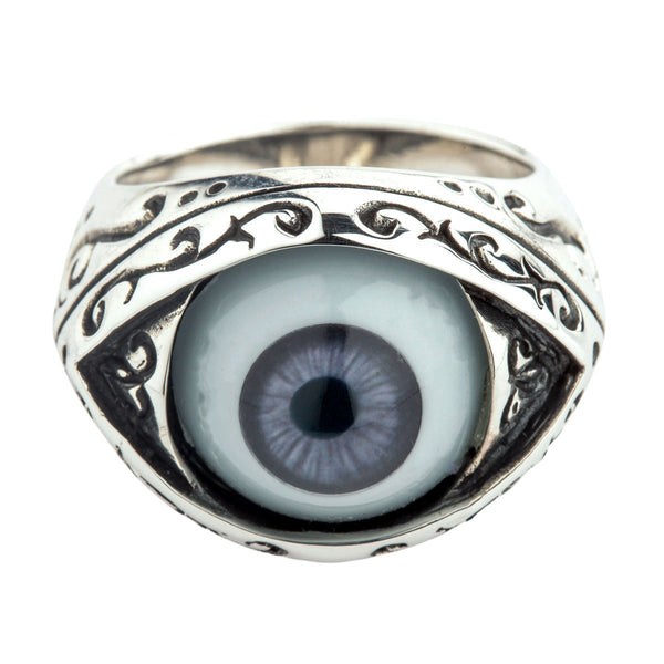The ring displays a large purple eye made of polymer material set in a precious silver setting. Polished silver reflects the light and enhances the magical properties inherent in the evil eye symbol. The setting is strewn with mysterious Gothic symbols that make this piece of jewelry truly spellbinding. Carved patterns stretch across the shank as well to provide a cohesive aesthetic.