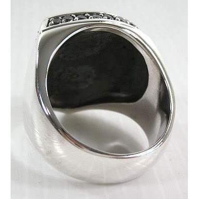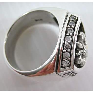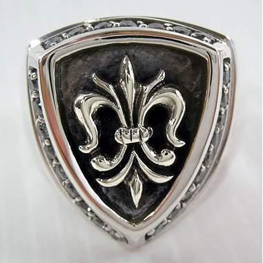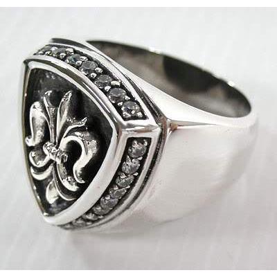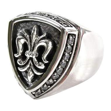 A symbol of unity, this masculine dress ring features the recognisable symbol of the Fleur De Lis. Long since recognised in the Catholic church, this three leaf lily has been bound together to symbol a united front within French history. Here, it sits proudly from a darkened silver shield background and surrounded by a border of shimmering clear diamond stones.