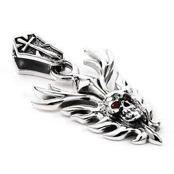 This piece takes its inspiration from gothic design - from the glaring face of an ominous skull through to the billowing flames that encircle it. Creating a stark contrast, two red garnet stones sit nestled within its eye socket - catching the light and flickering their menacing warning to all who gaze over.To finish, the classic bale has been re-imagined and transforms into a cross-adorned coffin. The pendant sits flush against the neckline, for comfort underneath jumpers and leather, and provide the finishing look to any rugged outfit.