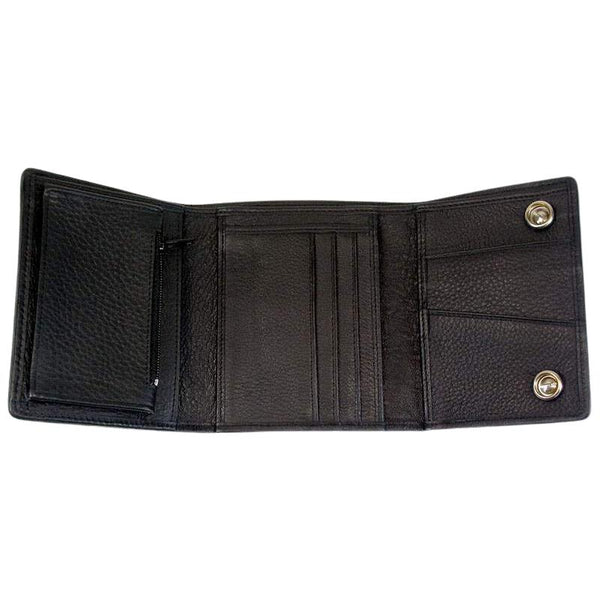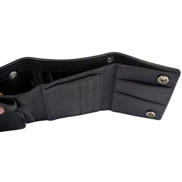 Our Genuine Cowhide Leather Biker Wallet combines timeless style with practical function. Compact enough to slip into pockets or small bags, it can be taken on the open road - providing storage wherever your bike takes you. The entire piece is crafted from the finest cowhide leather.Our skilled craftsman then moulds, stitches and shapes this fine material into a fully functioning wallet with enough style for anyone. Two ornate silver-tones buttons sit at each corner of the front flap, drawing in the eye every time you go to pay. Taking many hours to create, each tri-fold wallet is entirely unique and custom-made.