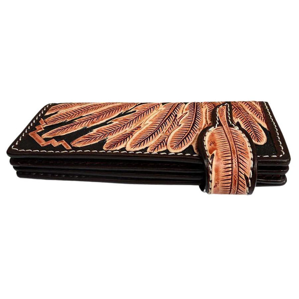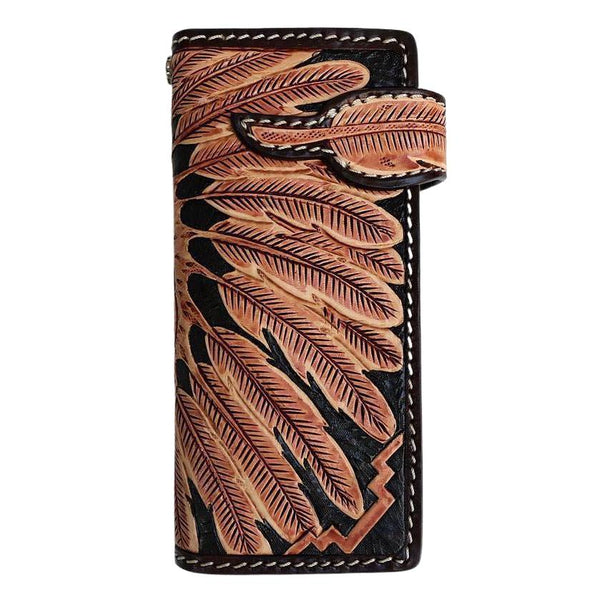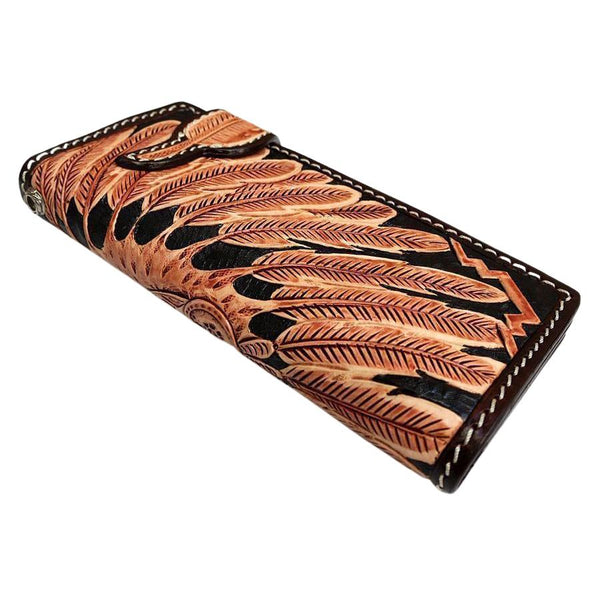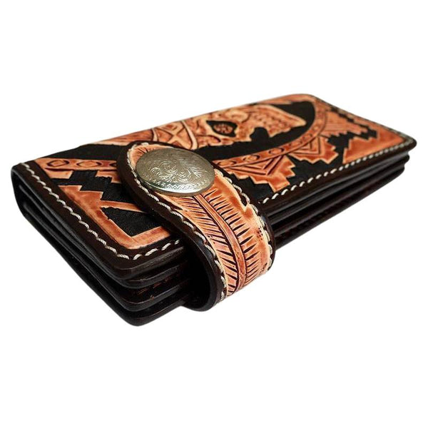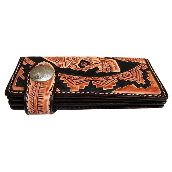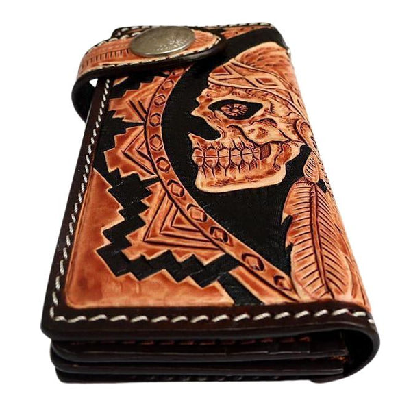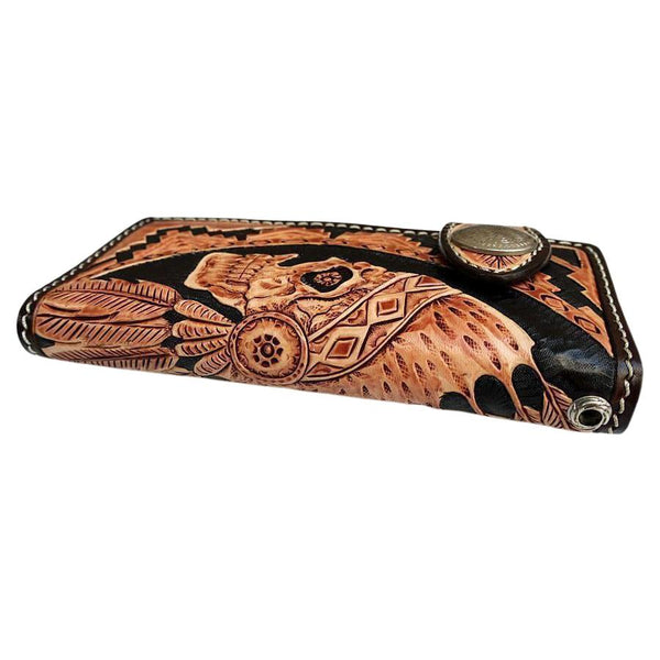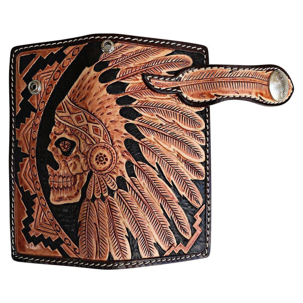 As someone seeking exceptional craftsmanship, our Indian Skull Biker Wallet promises to impress. Inspired by tribal design, it boasts the intricate detailing of a glaring skull dressed in an authentic, red Indian headdress.