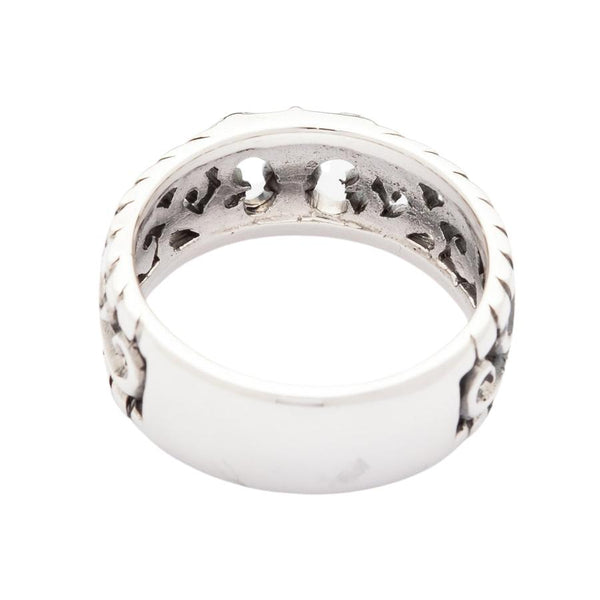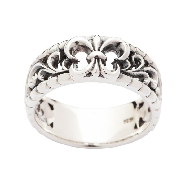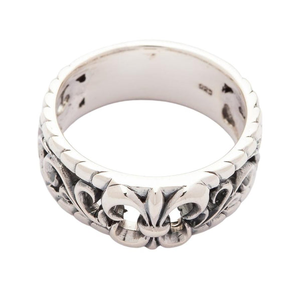 Made from heavy solid sterling silver, this fleur ‘de lis themed ring is a must have for your biker ring collection. It is a beautiful ring made form sterling silver and features cut out emblems of fine design and craftsmanship.
