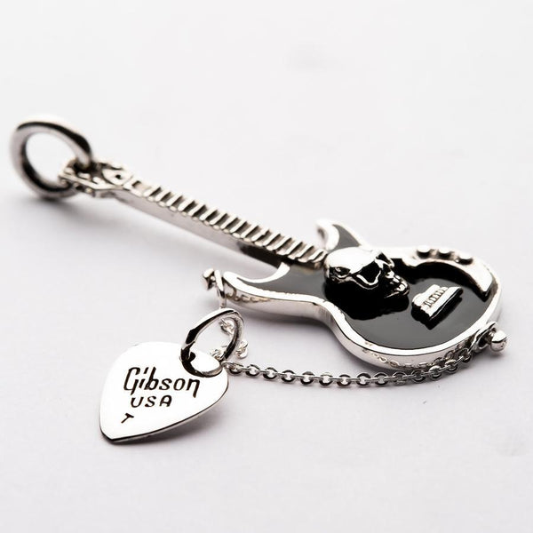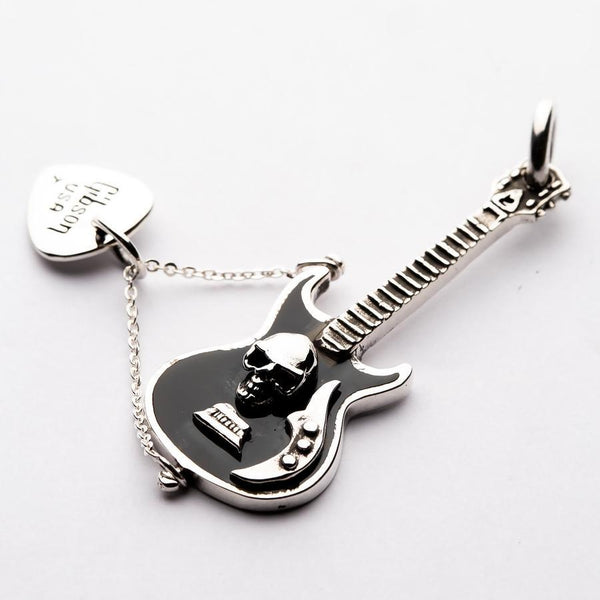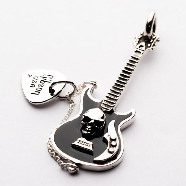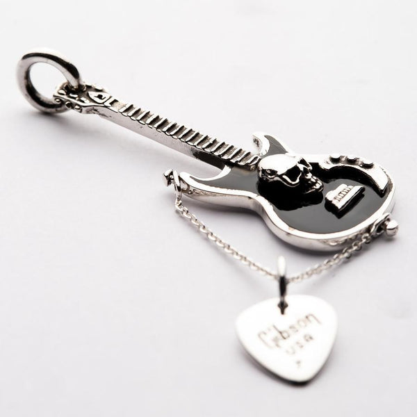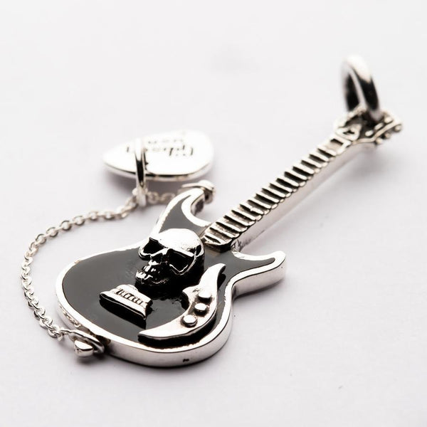 This pendant has been crafted by the hands of our skilled silversmiths using 100% solid sterling silver. Not only does this give it impressive durability, but the weighted finish defy's the affordable price tag. An intricate guitar exhibits the glaring face of a skull, nestled in black enamel and paired with typical instrument details.The accompanying pick works to heighten the connection between style and music - a glaring peek into the soul of your obsession with rock and roll music. This pendant can be slipped onto the chain of your choice and sits flush to the chest for all-day comfort. The ideal gift for the rocker or biker in your life.