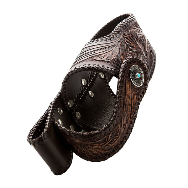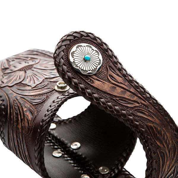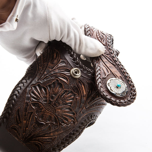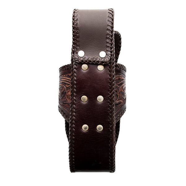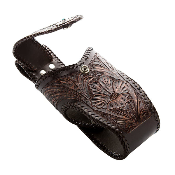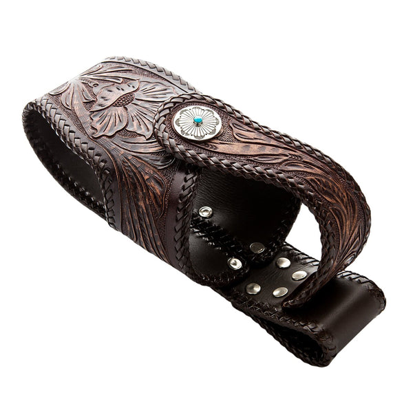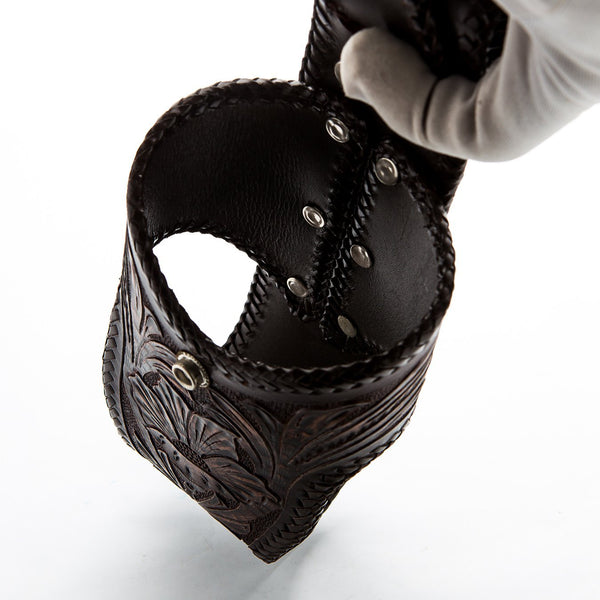The holster is made of high-quality cowhide leather known for its longevity and nice texture. The leather is adorned with an intricate floral motif carved by hand. The edging is complemented with braided stitching that adds more character to the piece and makes it extra durable. A silver clasp brings the desired change of color plus it allows tying this holster together with your biker jewelry. The clasp carries a tortoise detailing and a carved floral design.