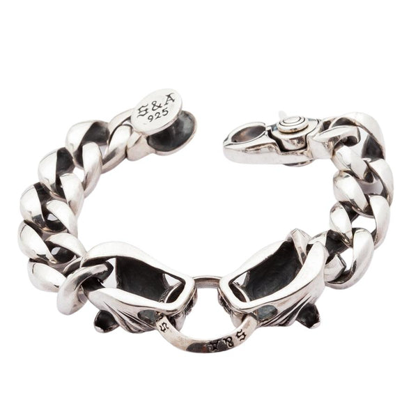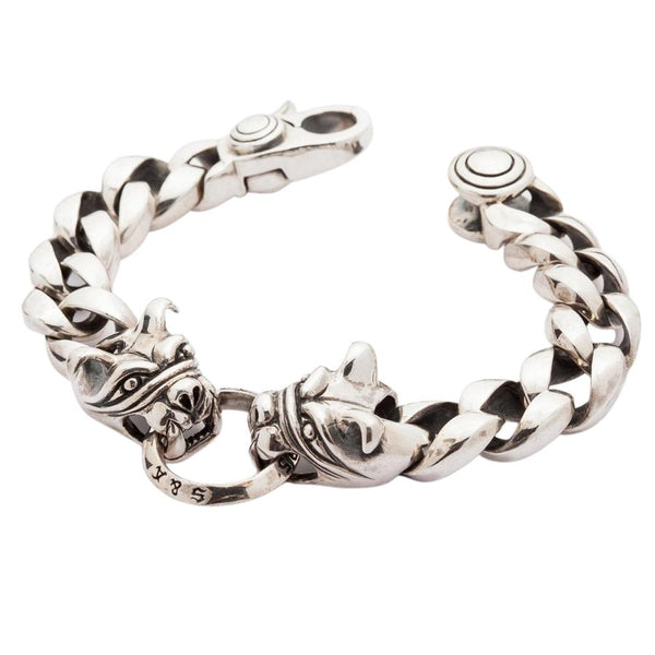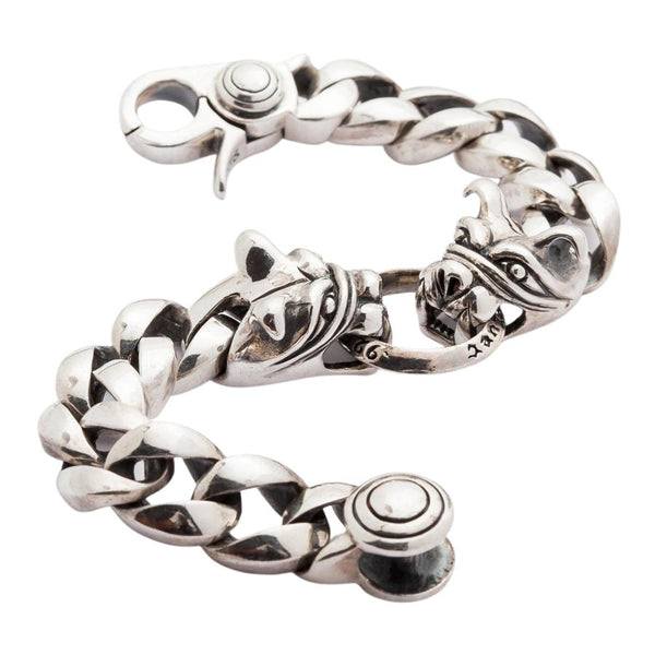 Produced using only the highest quality solid sterling silver, polished to a fine sheen, our heavy bulldog silver bracelet is as fiercely strong and enduring as the mighty bulldogs it depicts.