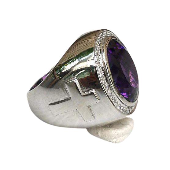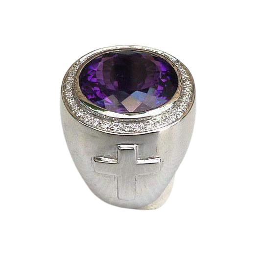 This remarkable ring is comprised of entirely 925 solid sterling silver and features an exquisite, breathtaking design, with an enormous sparkling inlaid natural amethyst oval cut gemstone surrounded by 36 brilliant-cut dazzling clear stones circled around it, all cut and polished to perfection. The silver band features a cross exquisitely carved on each side.You don’t need to worry about being a Bishop to wear this bishop ring! This spectacular work of art and timeless mastery offers an outstanding ring suitable for any occasion and certain to impress.