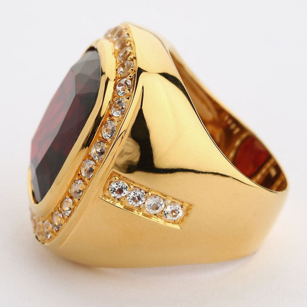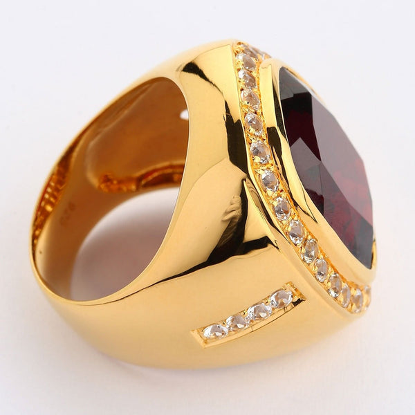 The ring boasts a ginormous – 21 carat – natural garnet stone in a deep red finish. Its 58 facets (this is how many cushion cuts provide) reflect and enhance sunrays to ensure maximum attention to your persona. But this is not enough; that’s why we added 36 genuine clear sapphires around the setting and along the ring’s sides. Not only do they take the sparkle to a whole new level but also make a contribution to the sense of sumptuousness.When putting this ring on your finger, you will immediately feel its premium weight. 21 grams of top-notch sterling silver make this piece impressively solid and hefty. On top of that, silver core lets us offer unbelievably affordable price compared to gold rings. But don’t worry, this ring is not deprived of gold – a thick layer of the sunny metal (3 microns) is there to enhance its noble look and feel.