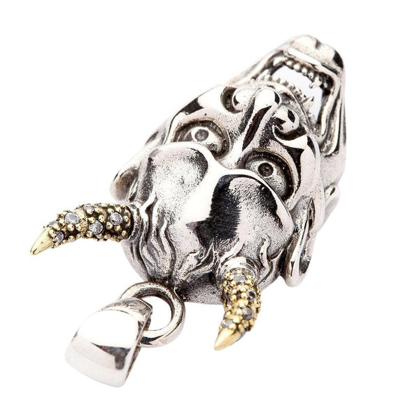 A powerful statement to your rivals to show that you spare no mercy when you are double-crossed, this is a symbol with a sweet side too. A victim of unrequited love, the Hannya has a sad past but she has become wiser because of it. She is often used within modern Japanese culture to ward off evil spirits, thought to represent good luck to those who wear her.Our Hannya Pendant has been made with a variety of materials, with the highest-grade sterling silver making up the majority of the design. The marking of true quality, the 925 hallmark, can be found added discretely to the back, as proof of durability and high standard manufacture. The Hannya’s deep set furious eyes have been brilliantly carved, as well as a flared nose and ferocious grimace – nothing has been eliminated from this incredible image.