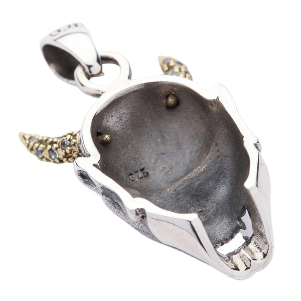 The devil horns have been adorned with shiny brass and clear stones to draw the most attention to this part of the design. A light, compact motif that is certain to have a big impact, this pendant hangs from a thick 18” sterling silver chain and is sure to be a conversation starter – if people are brave enough to talk to you!