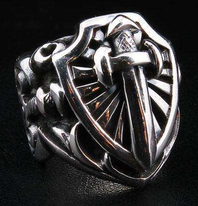 Intricately carved and produced by our talented Silversmith, this Sword Knight Templar Huge Solid Sterling Silver Ring features a large shield with a vertical mighty sword displayed valiantly on the ring face, while another decorative sword is carved around the band.