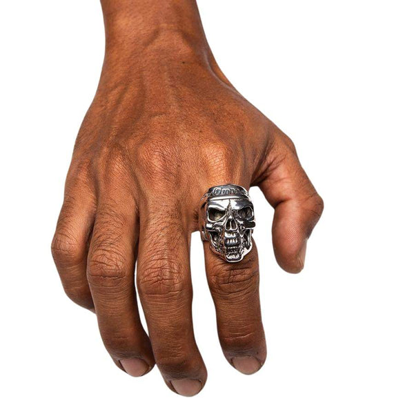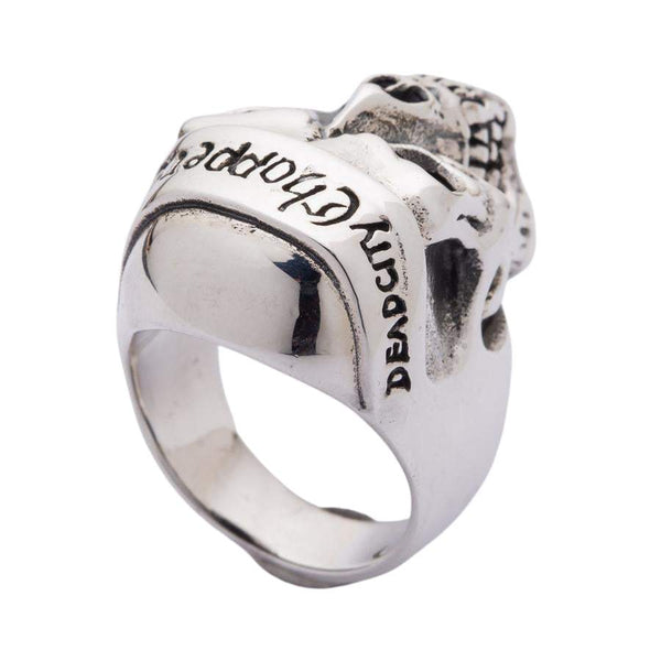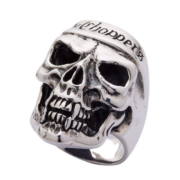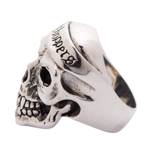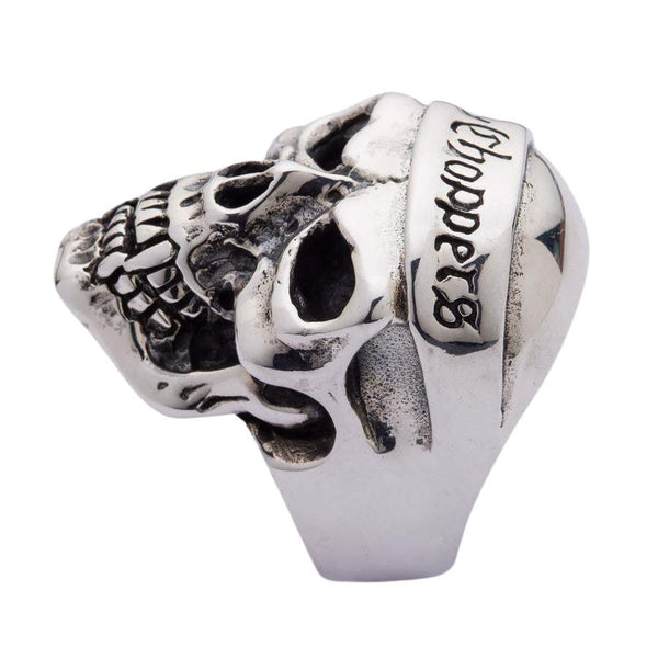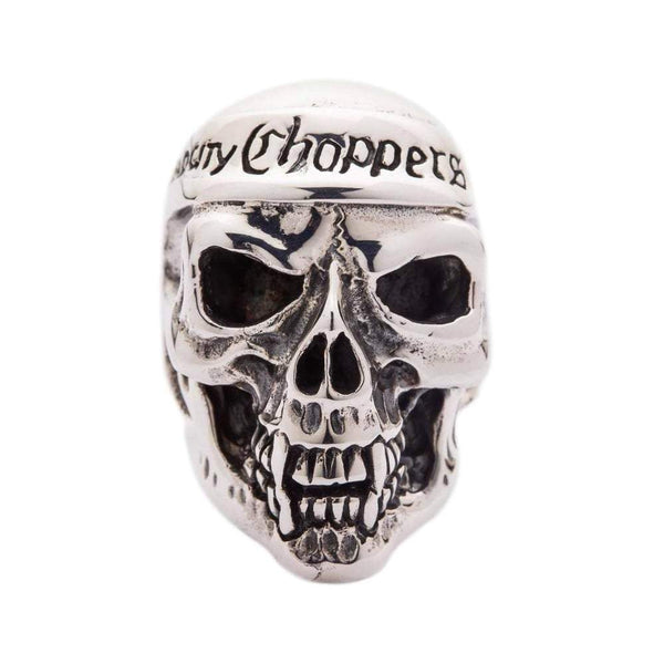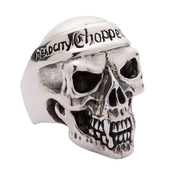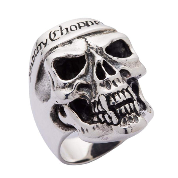 Featuring a large, ominous skull, this captivating biker chopper skull ring harbours some seriously impressive detail and is guaranteed to stand out! The skull wears a bandana with clearly carved lettering to form the words ‘Deadly Choppers’.
