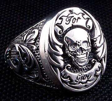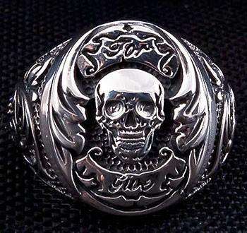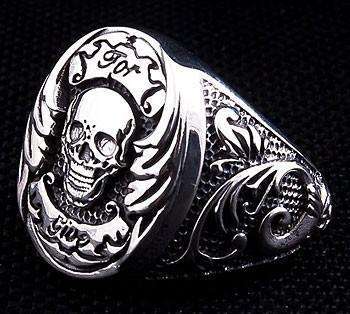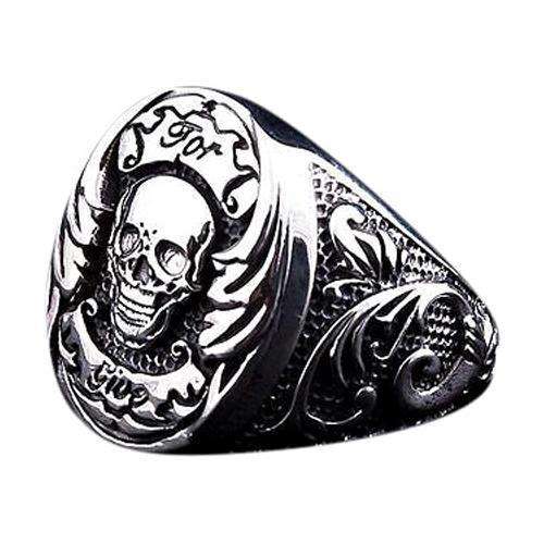Made from the finest, highest quality 100% sterling silver, this Por Vida Sterling Silver Skull Ring features a intricately engraved, decorative, slightly floral design around the front disc and outside of the band. On the main disc of the ring, there is a small but fearsome skull with the wording ‘For’ ‘Give’ above and below.