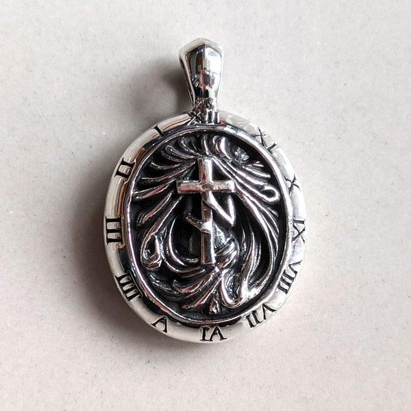 The centerpiece of this Silver Cross Gothic Pendant is a Latin cross and the mysterious figure that holds it. Is it Christ? It is somebody else – you will have to answer this question on your own. Whoever this person is, they are caught in a swirl that hides their face from us. The image is placed on the oval convex plate embellished with Roman numerals, just like a clock. However, unlike a clock, the digits are in reverse. Why? Again, you will have to solve this mystery for yourself.
