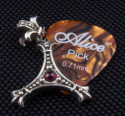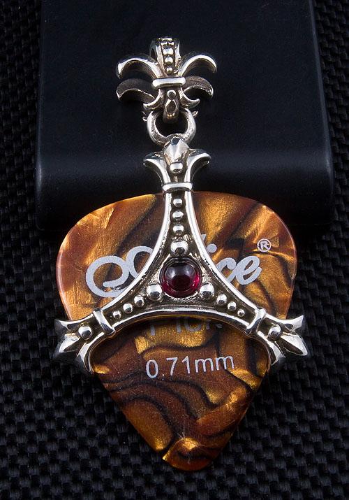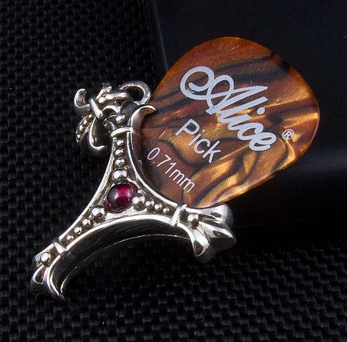 An appealing accessory and serves a useful function. In the centre of the pick holder pendant is a Ruby Red stone, which will grab anyone’s attention.This is an ideal gift for any musician or pick collector.