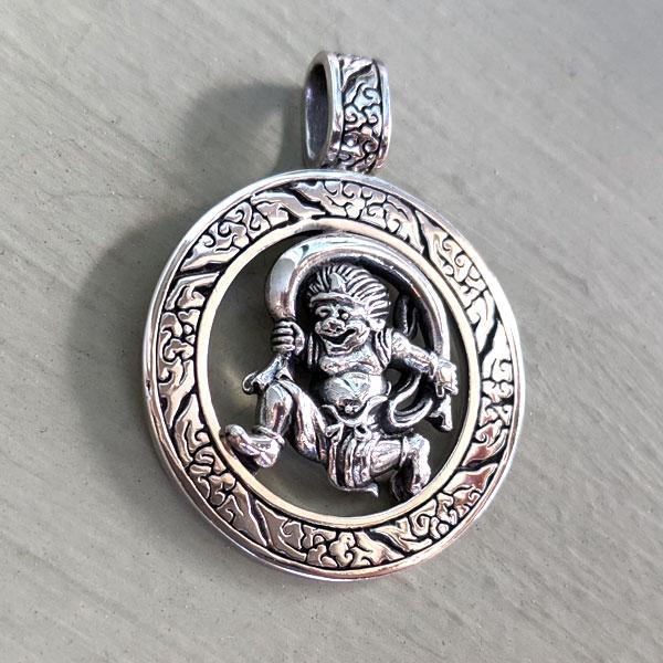 According to legends, the god Fujin, one of the oldest Shinto deities, lived even before the creation of the world. At the dawn of history, he released the winds from his bag to dispel the morning fog between heaven and earth. He helped the sun rays to illuminate and warm the earth. Once upon a time, he was an evil deity but he lost his battle with Buddha and now serves the good guys. Just like Fujin, you can tame your inner daemons and nurture your positive traits. Fujin talisman will help you remain strong and pursue your goals.Out of respect for Japanese culture, we have made this pendant by hand from sterling silver of the highest quality. Ornaments made from this noble metal acquire the meaning of precision, security, intelligence, masculinity, and reliability. The pendant depicts a traditional image of Fujin as a demon in leopard skin with a bag of winds in his hands. The figure of the deity is encircled with a hollow disk displaying oriental patterns. The item does not come with a necklace but you can easily pick a silver or leather necklace from Bikerringshop assortment.
