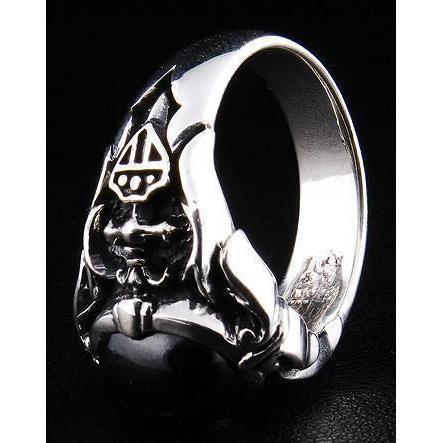 This ring has been exquisitely crafted from solid sterling silver for durability and strength. The large, round-cut black onyx stone nestled within the medieval design draws in the eye - a symbol of protectiveness and power. This large ring is truly a piece for bikers with a dedication to their bold and tough style.