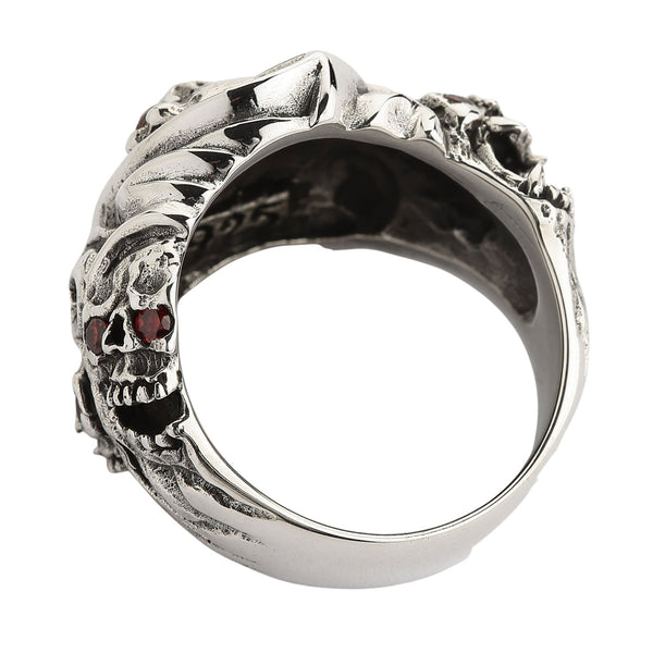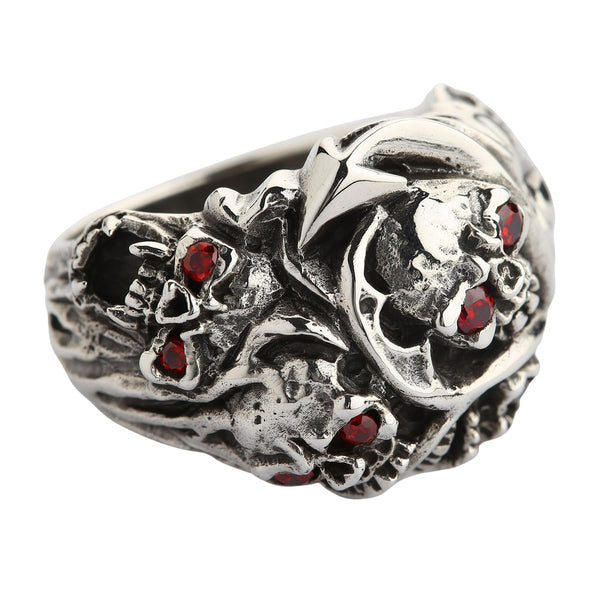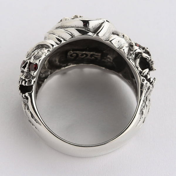 This ring came straight from hell. A clique of fierce skulls is proof of that. You can see in their fanged grins, horns, and pointed tails that they are of a demonic race. But don’t worry, if you treat your skulls with respect, they are no harm to you. On the contrary, they are a powerful talisman that ensures protection against death. For this reason, this ring is an excellent accessory for bikers and everyone who believes in the supernatural powers of skull jewelry.This ring is made of noble sterling silver. We polished some of its raised parts while leaving recessed ones rough and darkened to emphasize its ruggedness. Red CZ stones in skulls’ eyes add the arresting quality and enrich this piece with radiance. We craft our products by hand to preserve a touch of individuality in every piece you buy.