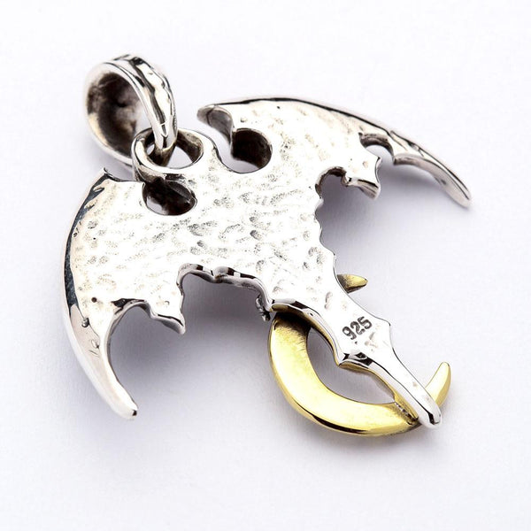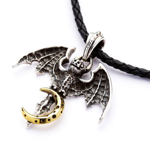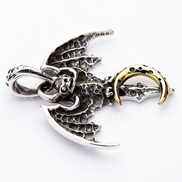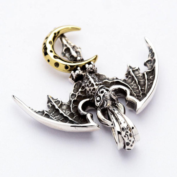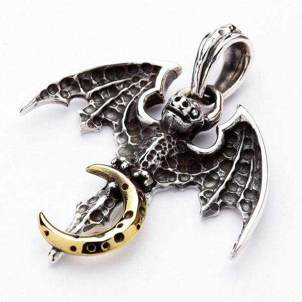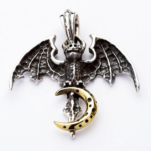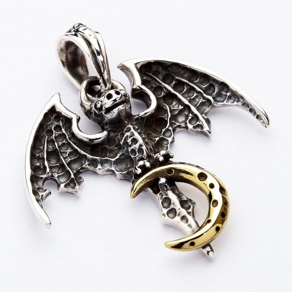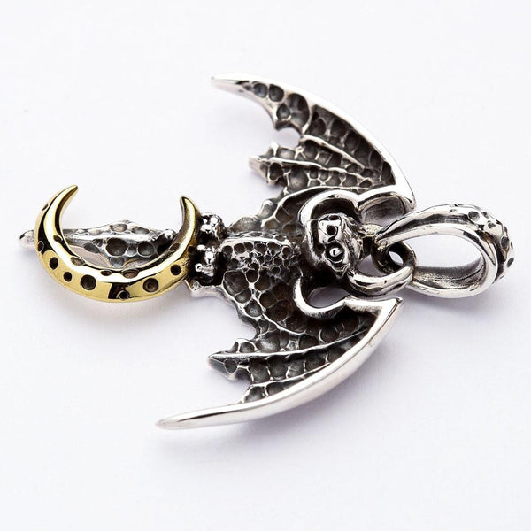 The pendant showcases a huge intimidating bat that is about to turn into a vampire. It spread its mighty wings to instill horror in everyone daring to cast a glance. In its paws, it holds the moon, the patron saint of the children of the night and one of the much-loved symbols in Gothic. We show the moon with the difference, though, because of its unusual yellow finish. We provide you with an opportunity to stand out, so why not seize it?Except for the moon, the pendant is made of solid sterling silver adorned with blackening for maximum impact. You will love the detailing on the bat’s wings, so rough, decrepit, and pockmarked. We made it all by hand so that you can have a truly valuable piece of Gothic art.
