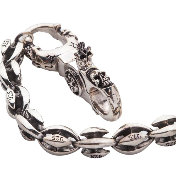 The high shine polished allows the chain to glint against the light while darkened engravings stand out against the stark base. The long length chain makes storing your wallet safely and stylishly an easy task, with the help of two large lobster clasps at either end. Throughout this entire piece, our craftsmen take inspiration from the delicate blossom flower, bringing it's slight petals into the engraving. In addition, the feature of ominous skulls brings about a gothic feel and one that lends itself effortlessly to the style of a modern man.