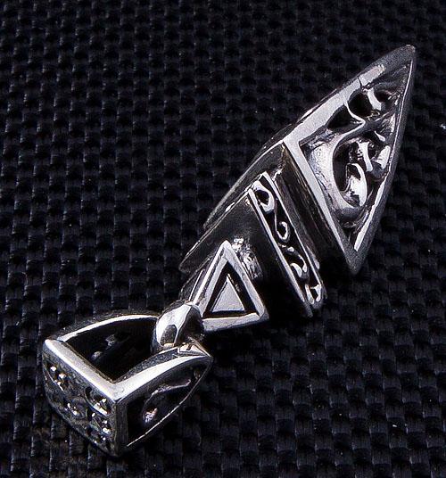This pendant is assembled from three similar triangles that constitute a pyramid. In the esoteric sense, a triangle contains the laws of the cosmic universe. This sign reflects both the hermetic law of polarity and the philosophical principle of the unity and struggle of opposites. A triangle consists of three sides; three is two plus one, which corresponds to the Tao philosophy where Yin and Yang, male and female principles, are combined in perfect harmony. This said, a triangle can symbolize men and women alike. When facing upwards, a triangle denotes a female while downwards positioning implies a male.Aside from its meaning as a triple triangle, a pyramid has its own symbolism. People have always seen sacred meaning in pyramids. They were used to communicate with otherworldly forces. It was believed that a pyramid can help a person to defend himself from harm and negativity. In addition, if you wear a pyramid-shaped talisman, it will absorb negative energy and convert it into positive energy.