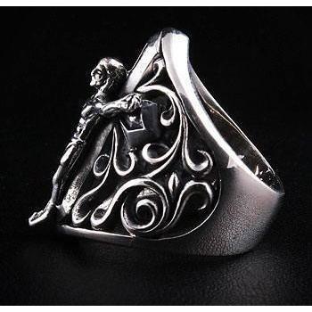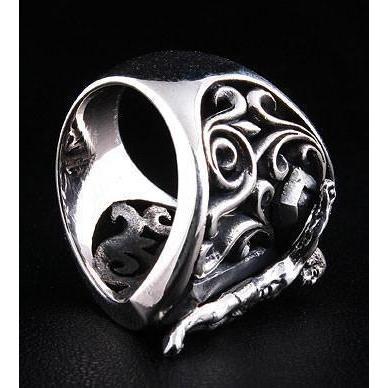 This detailed sterling silver ring has been designed for the strongest of men, due to how thick and heavy the ring is. Durable and sturdy, this ring will last a long duration of time.