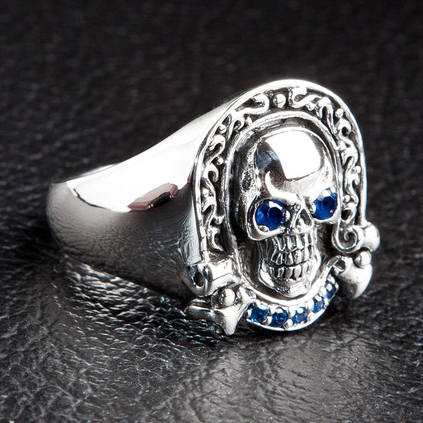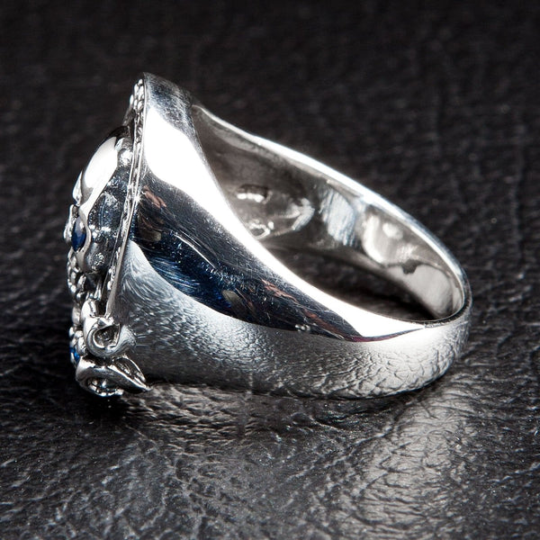A gothic accessory with exquisite detail, our Designer Rider Skull Ring is a piece of true craftsmanship. The snarling grit of a skull jaw pairs with majestic blue eye-set stones in a piece that seems plucked from some sort of alternate underworld. As a border, an intricate web of swirls and markings blend together in this custom-made ring that stands miles above the rest.