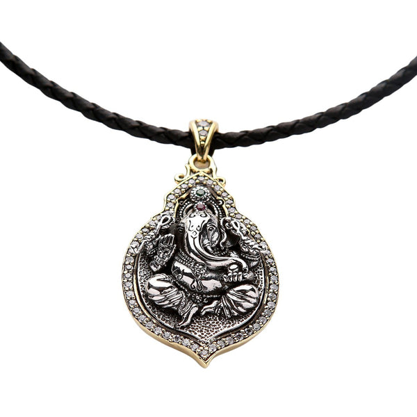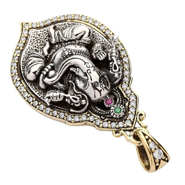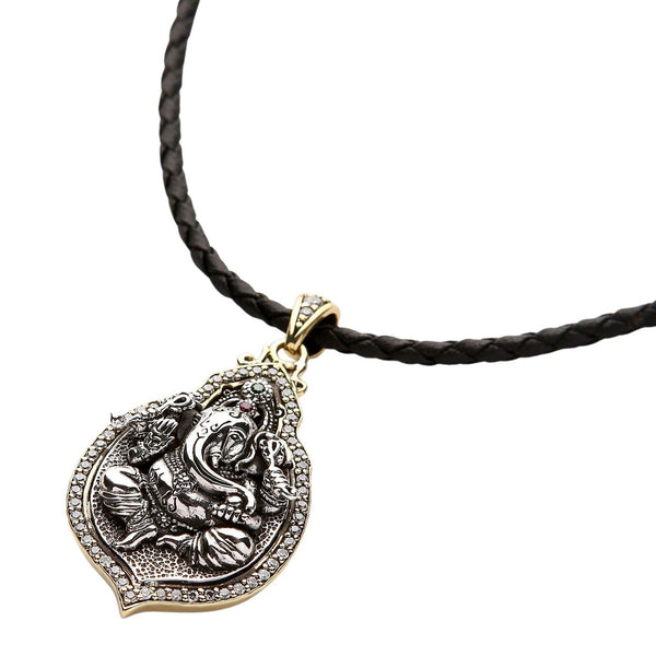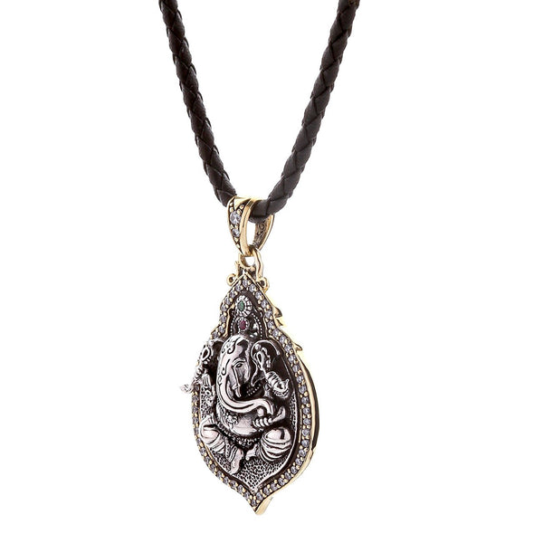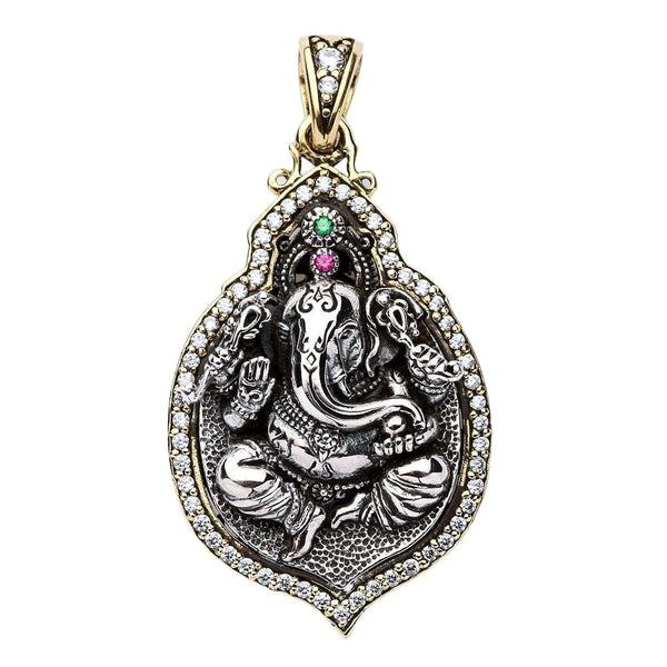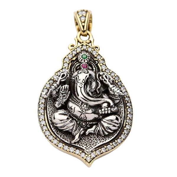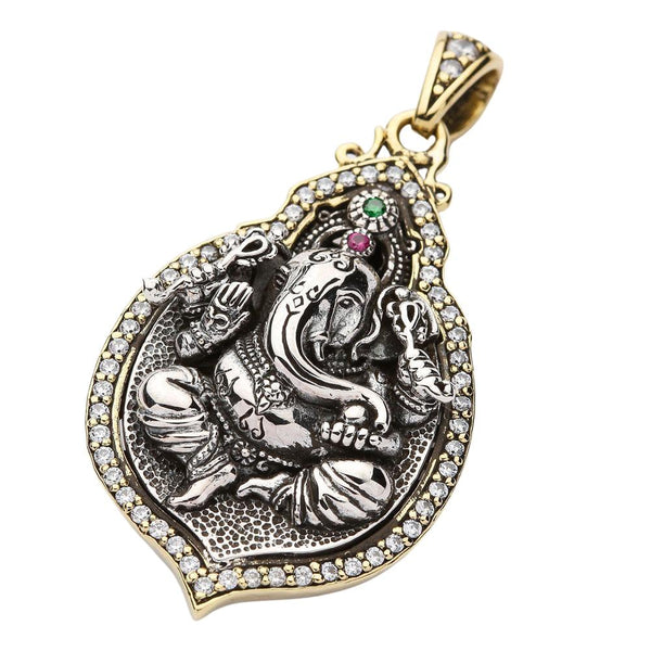 Every part of the Ganesh body is symbolic for one or more reasons. For example, he has large ears, to encourage us to listen more, and only one tusk, reminding us to keep what is good and lose what is bad. His large stomach shows us to digest all that is good and bad, while his rope shows us that we must pull ourselves upwards to reach our goals.Beautifully nestled in an attractive pendant shape, this high-quality 925 sterling silver design has been carefully crafted to ensure all the important elements have been faithfully depicted. Surrounded by attractive clear stones to add a luxurious edge and featuring a delightful gold-plated design on the back, this is an unusual piece that allows you to find something new each time you gaze upon it.