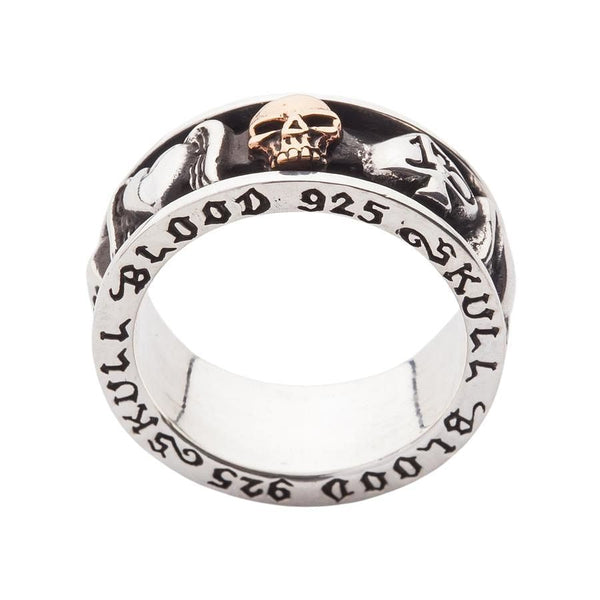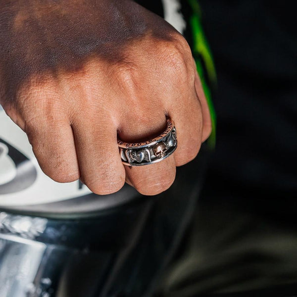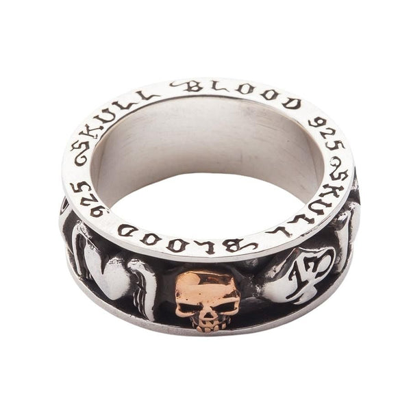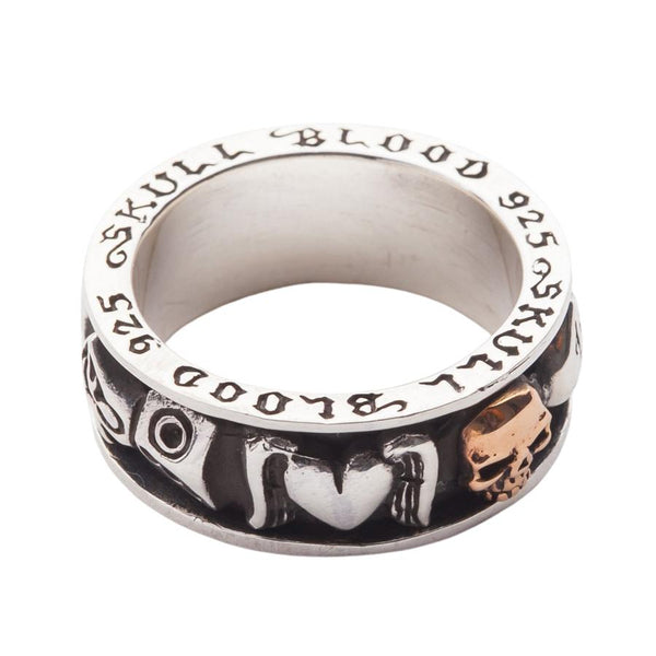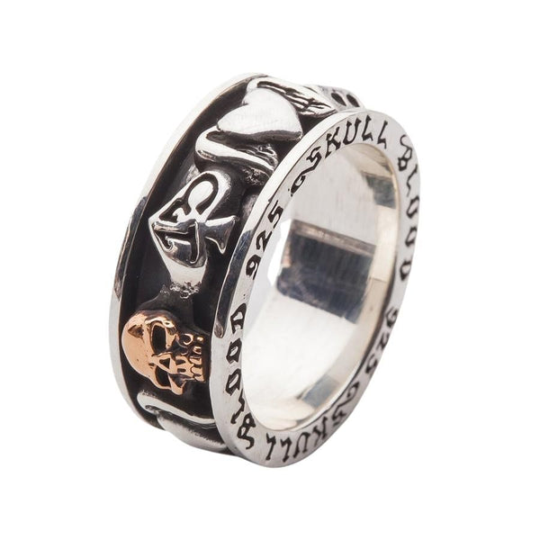 Inspired by gothic design, this Sterling Silver Gothic Spinning Ring is a devilish addition to your collection. Taken from the underworld, the line-up of menacing symbols includes a winged heart, the 13th spade and a gold-plated skull head. It features a unique spinning inner ring, allowing you to dictate the dark message portrayed to the world at any given time.
