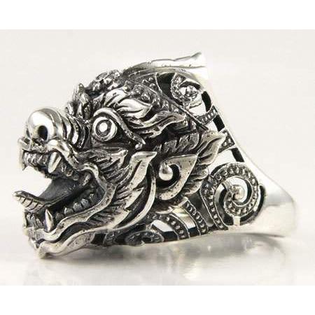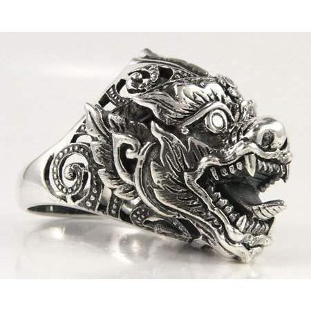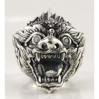 Crafted entirely by hand, this rare ring is unique to anything else on the market. From the clear stone set eyes through to the fearsome mouth and windswept fur, this piece speaks to the skill of our craftsman. It has been made from solid sterling silver for a premium weight and darkened to accentuate each feature.