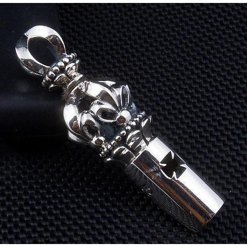 Our Master Craftsmen uses solid sterling silver to mould the whistle design, adding fleur de lis and cross detailing along the body for striking effect An ornate crown takes centre stage in place of a traditional bale and provide a sense of regal beauty to an accessory that already promises to impress.The whistle is also fully functional, creating a sharp whistle when air is blown through it. Alert everyone to your arrival and ensure your accessories are truly appreciated with this one-of-a-kind whistle pendant.