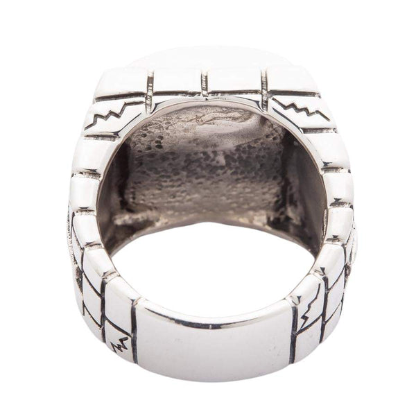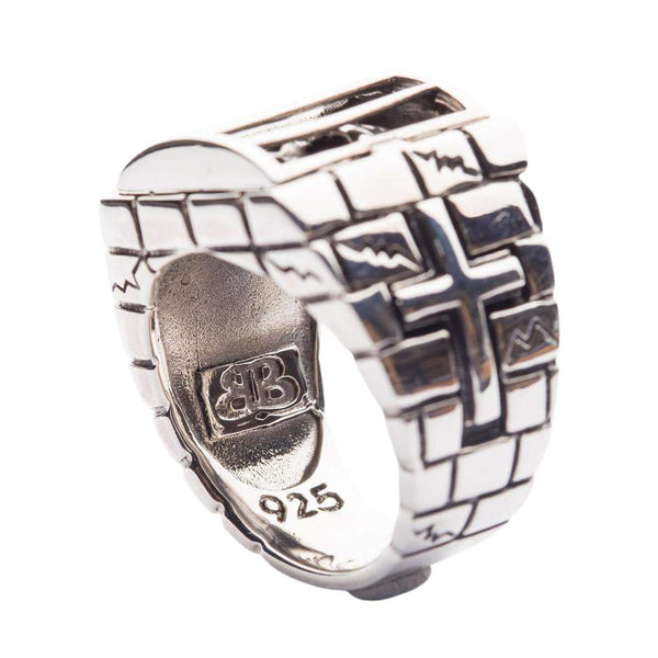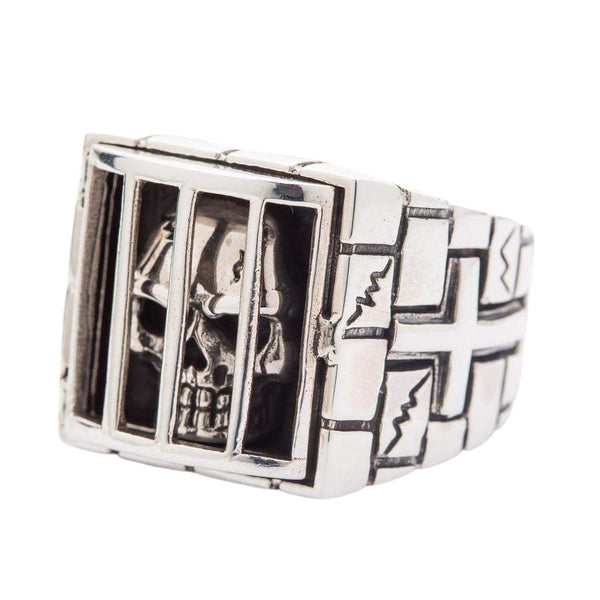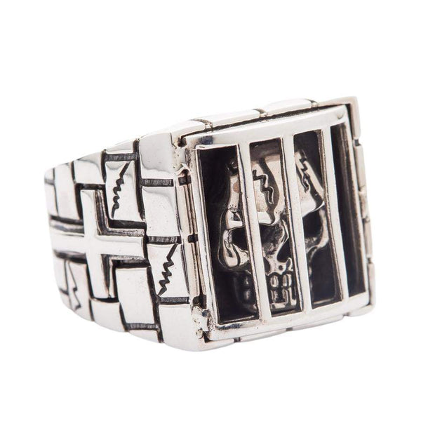 In biker culture, skulls have a positive meaning denoting hope for after life and resurrection but their primal meaning is death. Each side of the ring features a Latin cross and you understand that there is not just a petty demon inside but the Death itself. Maybe while the death is locked, you will delay the visit of the Grim Reaper? Or maybe it means that you can hide the unsightly sides of your personality such as greed, jealousy, lust, fear, etc. and won’t let them take control of you? The cool thing about skull biker rings is that you can give it any meaning you want, which makes them a more personal and intimate item.This ring is made stout to mimic a prison’s brick walls. At the same time, you can see so many cracks that it becomes clear that these walls are no longer able to hold back their captive. The skull has become a part of its cell and you can see cracks on its brow as well. The ring is cast from sturdy sterling silver polished to catch the light while the recessed elements are treated with blackening for more definition and dimension.