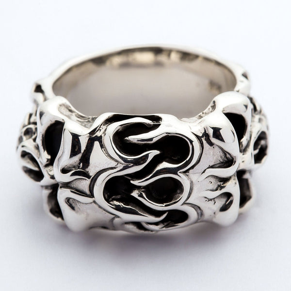 If you are looking for a large skull ring that stands out, you will probably love this design. This flame skull roller ring, made from solid sterling silver is beautifully made with the design going all along the band of the ring. It is nicely polished, with a width of 15mm. Its weight is 23g, and you can rest assured you are getting a solid ring that can be worn for years to come.