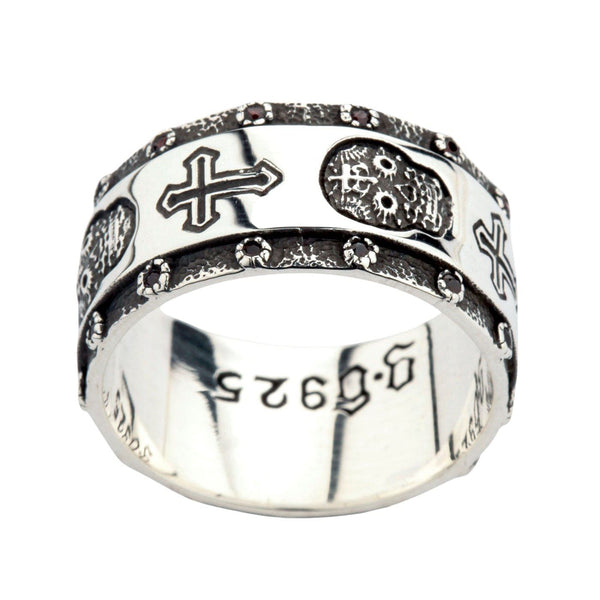 The ring provides a number of elements to capture glances. Its fairly large band of 12 mm (0.5”) is hard to ignore in itself but when it is adorned with incongruous symbols, you get one hell of a ring. The first thing that catches the eye is a skull image representing Santa Muerte. Although most people associate skulls with something spooky and violent, they are actually an ancient protective symbol. We adorned it with intriguing designs to honor the vibrant and festive Mexican culture. Next to the skull sits the cross, another symbol boasting incredible metaphysical capabilities. The skulls and crosses are arranged the way to create an infinity ring meaning you can turn the ring around your finger and the pattern will never end.