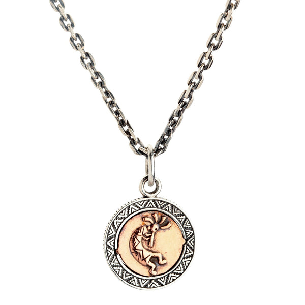 The back of the pendant is as exciting as its front. It carries the image of the god Kokopelli. Revered among Indians, the god brought abundance, fertility, and happiness for families. Kokopelli’s image is set off by a tribal ornament.
