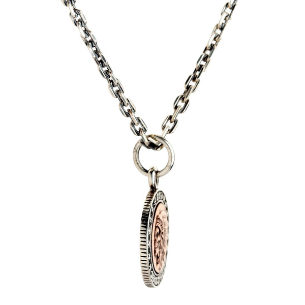 The pendant has a ribbed edging making it similar to a coin. Unlike modern coins though, it is made of precious silver with a dash of brass for an eye-catching contrast.