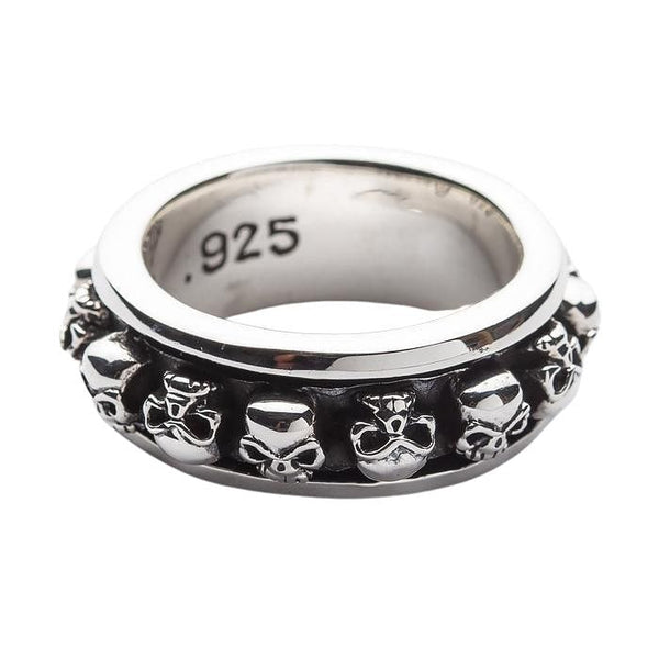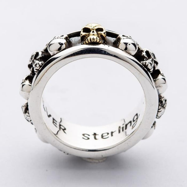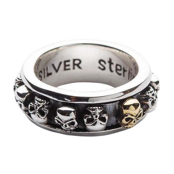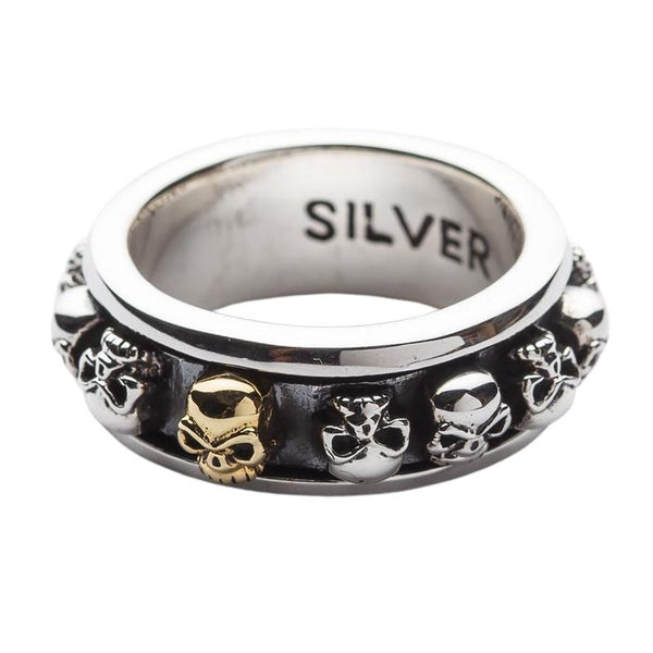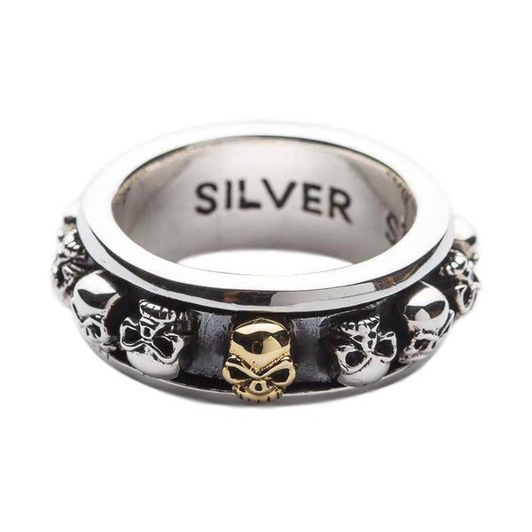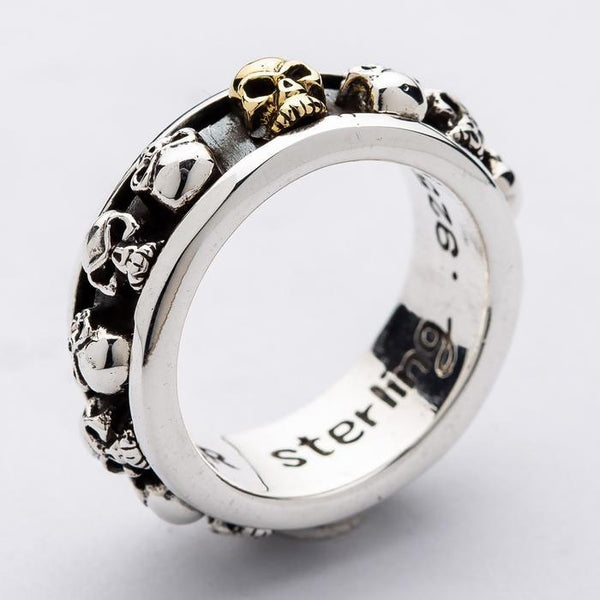 Hand carved for maximum visual impact, this Solid 925 Sterling Silver Skull Spin Ring for Men will make a standout addition to any biker’s jewellery collection. One of the most sought-after pieces in our best-selling skull ring range, it is made from high quality sterling silver that is hallmarked to guarantee its authenticity, and the band measures a generous 10mm wide.For depth and dimension, this Men’s Spinner Skull Ring is skilfully embellished with silver skeleton skulls, which stretch around the band in an eye-catching display. The centre skull has been dipped in 14k yellow gold for just a hint of contrast. A fabulous gift for bikers, goths and musicians, it will add the finishing to any outfit.