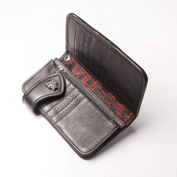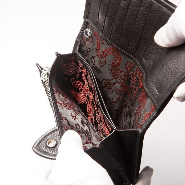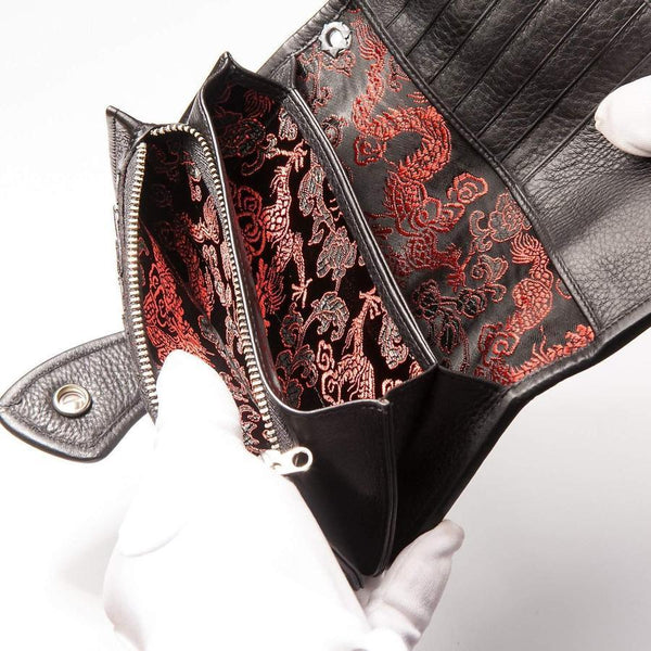 The twisted flame pattern that adorns the front has been created using high-grade stingray leather with a silken interior lining detailed in a red emperor dragon pattern. This wallet is a piece of true beauty, complete with slots and compartments for storing your essential cards and bills. It manages to be even more beautiful in real life than it is in the picture and is sure to delight.