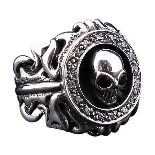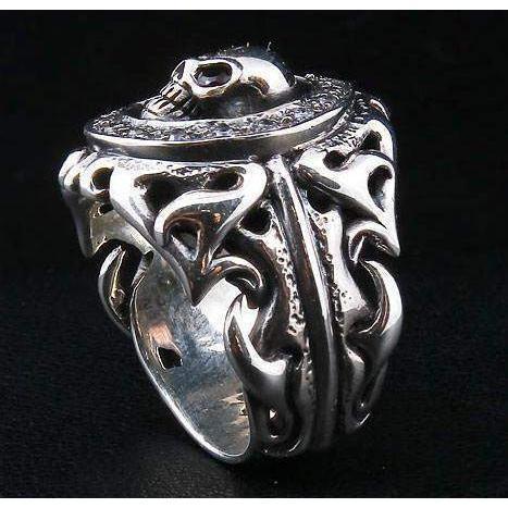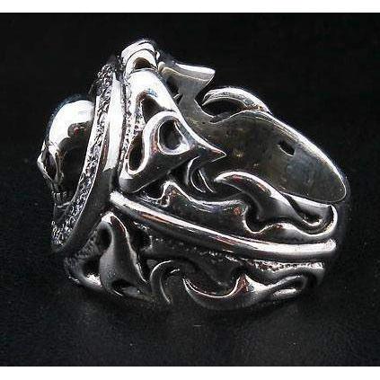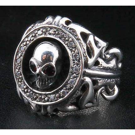 Made of solid sterling silver and featuring a unique design engravings of a skull, this is a one of a kind ring. The center piece skull features two blood red garnet gemstone eyes. Solid and masculine in design, this ring is a must-have for your biker jewelry accessory collection.