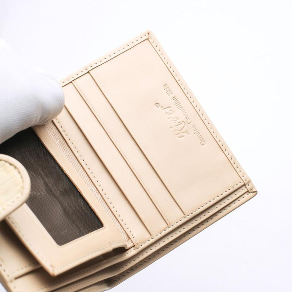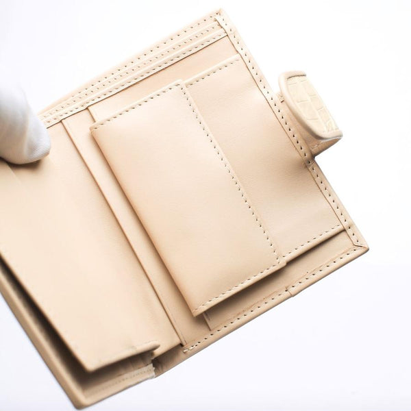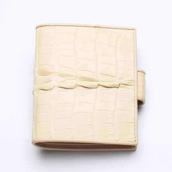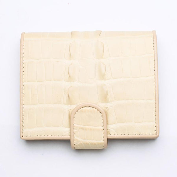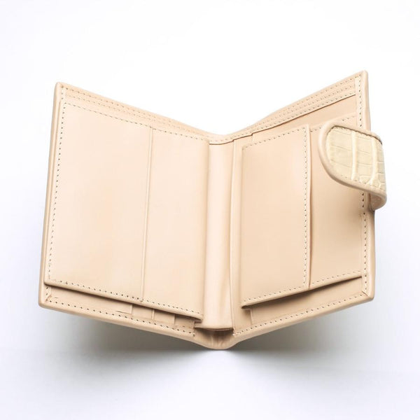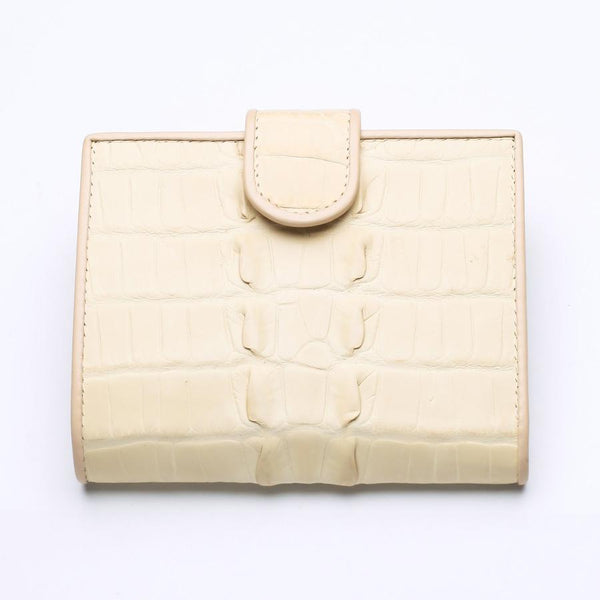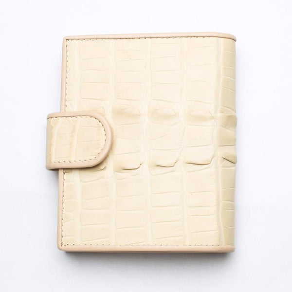 Here, a creamy crocodile skin has been re-imagined into a compact wallet – complete with coin purse and card storage.